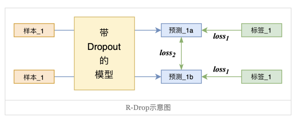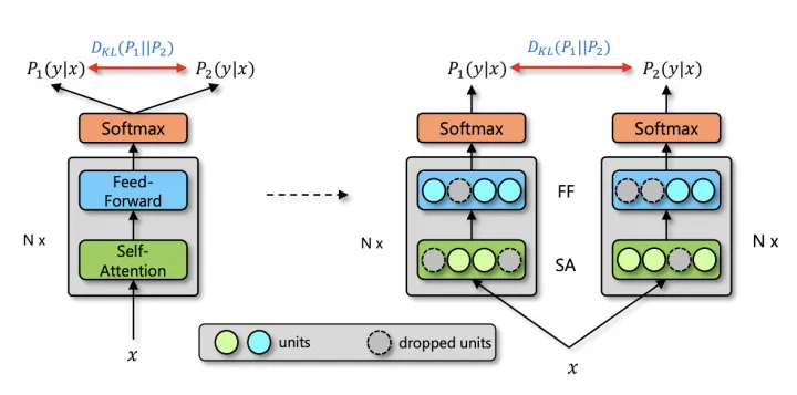 基于 Dropout 的这种特殊方式对网络带来的随机性,研究员们提出了 R-Drop 来进一步对(子模型)网络的输出预测进行了正则约束。