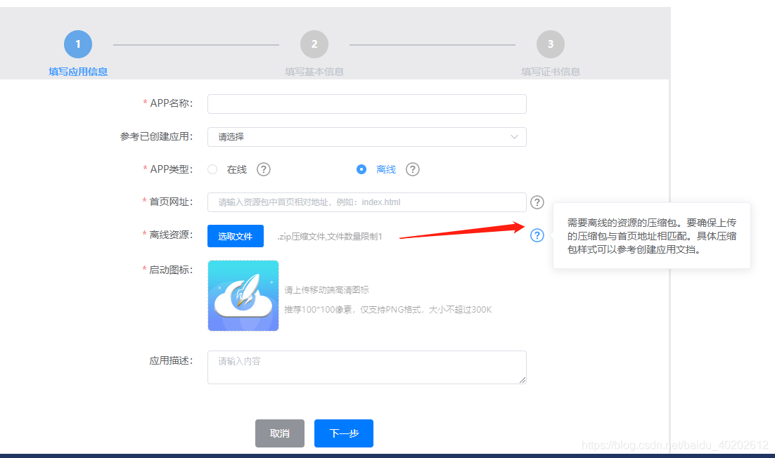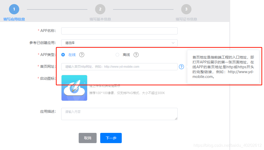 设置app名称、logo,选择app类型(在线或者离线),在线直接输入网址即可,如下图提示: