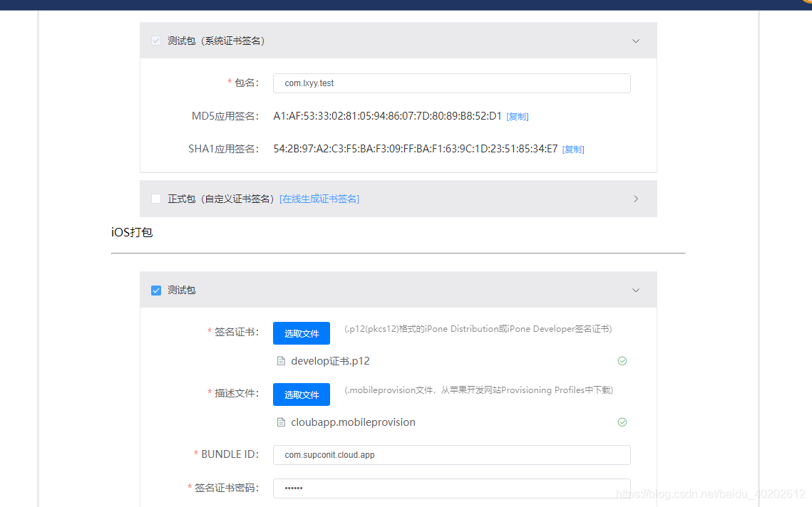 Android、ios证书设置,Android提供默认证书签名,如果想要生成ios安装包的话,需要单独填写ios证书信息,这里我填写下我的证书信息。