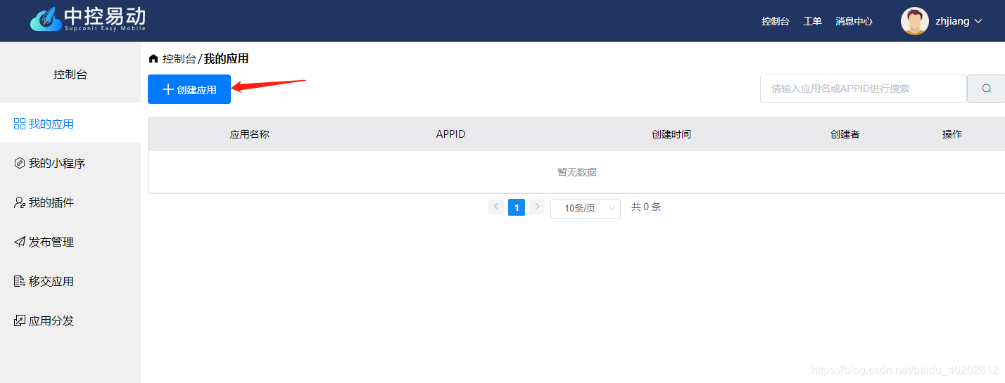 注册中控易动平台账号(https://www.yd-mobile.cn/),点击右上角 "控制台",进入控制台之后点击 "我的应用",找到创建应用按钮。