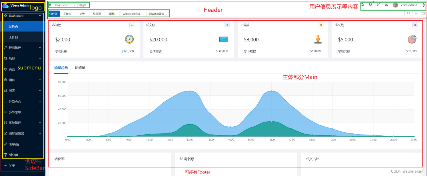 用户登录成功后,跳转主页面。后台管理系统页面的组成部分一般为:头部、侧边栏(导航栏)、页面主体部分以及可能会有尾部。下图为我截取的vben-admin的页面布局,可以看到包含Header、SideBar和Main(具体划分可能因人而异)。