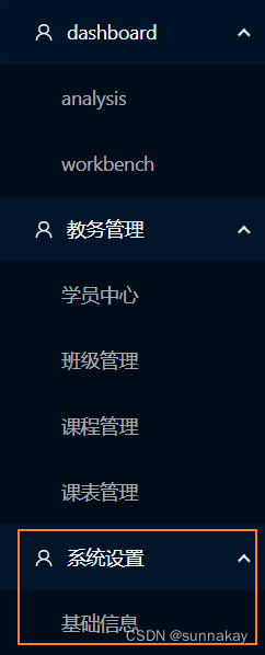 这里我使用根据角色过滤的方式模拟了整个过程,登录的用户角色为admin,最后页面渲染出的侧边菜单栏如下,可以看到因为系统设置下的基础信息没有添加’super‘角色,而职员管理和岗位管理路由我们添加了'super'这一角色,因此在路由过滤阶段,这两个路由被过滤掉,在最终页面上也不做展示: