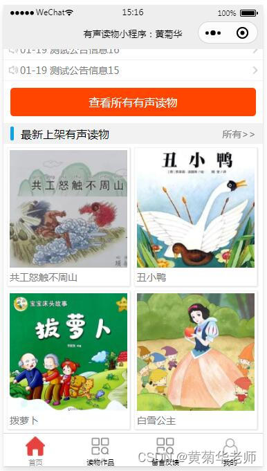 有声作品库:点击底部菜单有声作品中心,支持查看所有的有声作品