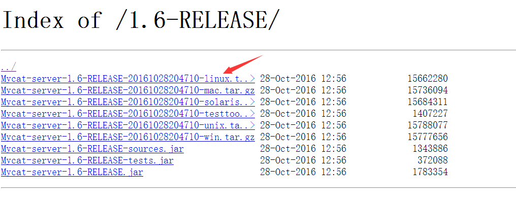 我的环境是linux,所以选择linux版本的mycat下载,下载到window后再上传到linux,或者直接在linux使用wget下载,比如 wget http://dl.mycat.io/1.6-RELEASE/Mycat-server-1.6-RELEASE-20161028204710-linux.tar.gz,解压