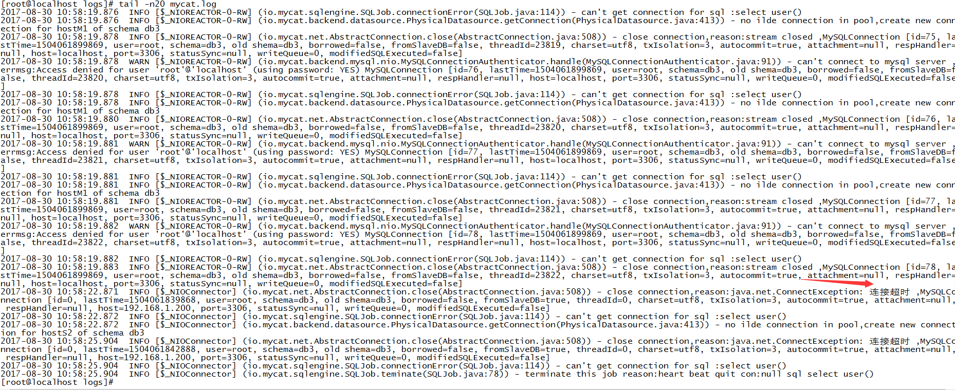 mycat的日志文件在MYCAT_HOME的logs下,打开mycat.log看看tail -n20 mycat.log