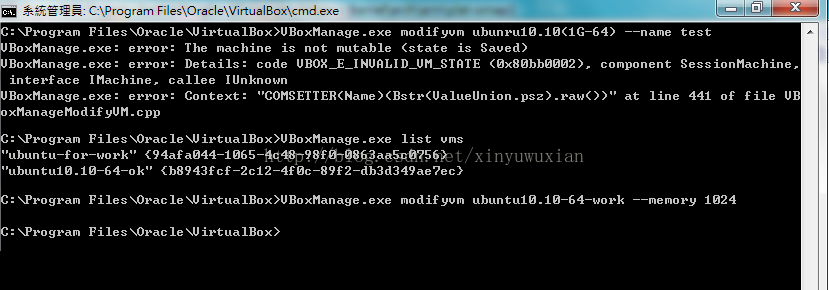 上面第一条提示错误就是说明你的系统没有关闭,无法配置,第二条命令获取当前安装的虚拟机,第三条进行重新配置,你可以用