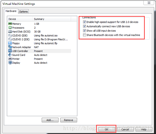 步骤2:弹出【Virtual Machine Settings】窗口,将【Connections】中的复选项按照如下图所示配置,最后点击【OK】即可。