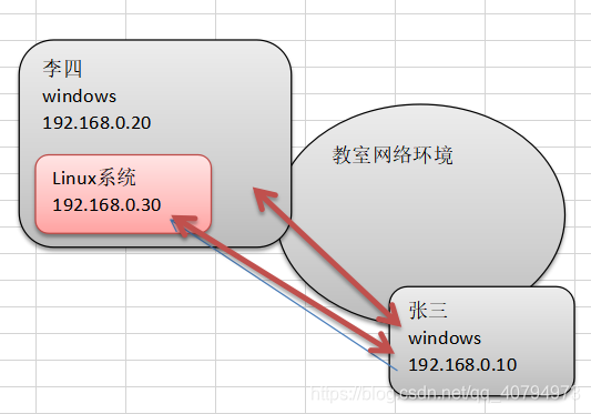 李四在他的电脑上装了一个虚拟机,网络连接方式设置的是使用桥接网络,这样的话他装的虚拟机的ip地址也在192.168.0.x 这个网段上。假设李四安装的Linux系统的ip地址为192.168.0.30,那么现在李四既可以和张三的Windows系统直接通信,也可以和他在虚拟机里面安装的Linux系统直接通信。