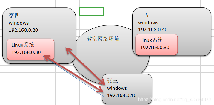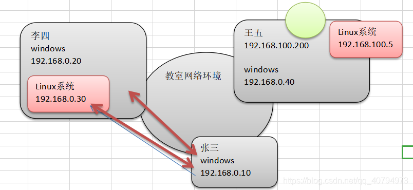有教室的一个网络环境,在教室里面有很多学生。假设张三的电脑是Windows系统、ip地址为192.168.0.10,李四的电脑是Windows系统、ip地址为192.168.0.20。他们在同一个网络环境(同一个网段)里面是可以直接通信的。