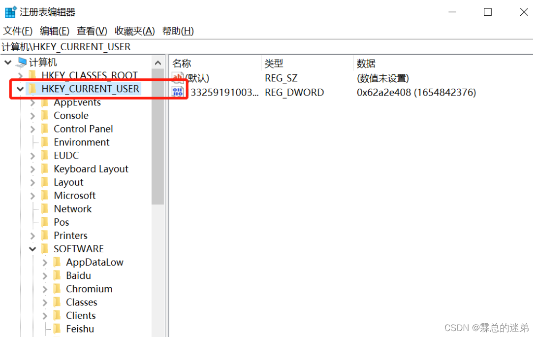 2、在注册编辑器中找到【HKEY_CURRENT_USER】目录