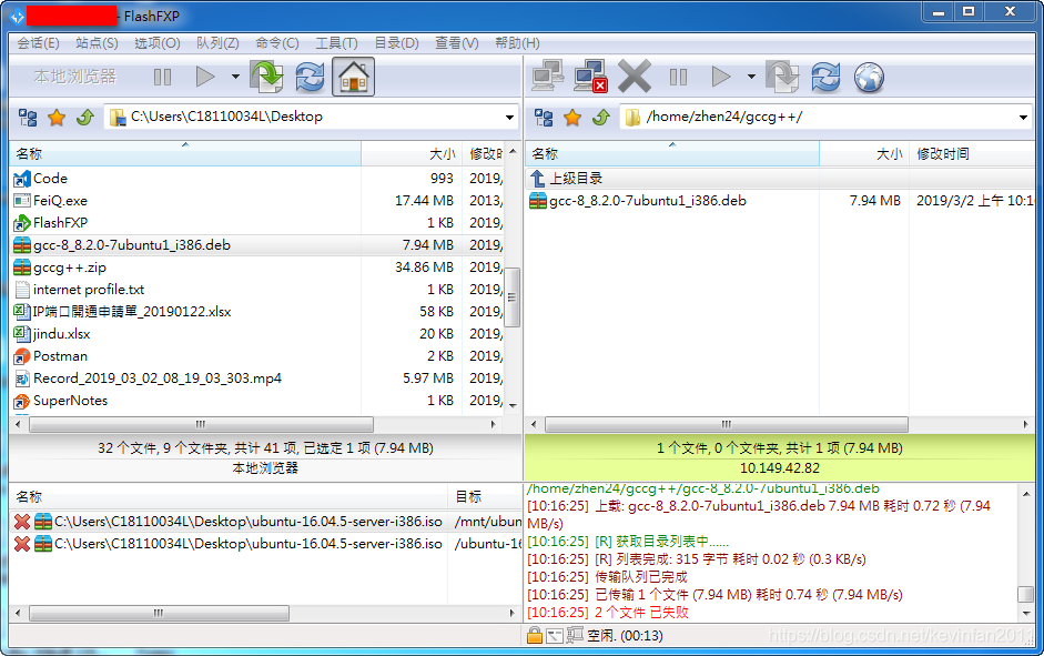 本来有网的情况下安装软件是特别简单的事情,只需要执行 “sudo apt-get install gcc ”即可,但是现在没网,所以这里我们需要自行下载gcc了,找台能上网的电脑:http://archive.ubuntu.com/ubuntu/pool/main/g/ 在这里下载你需要的gcc,找到对应的deb文件下载下来然后传到Ubuntu上,这里我用的是FlashFXP。