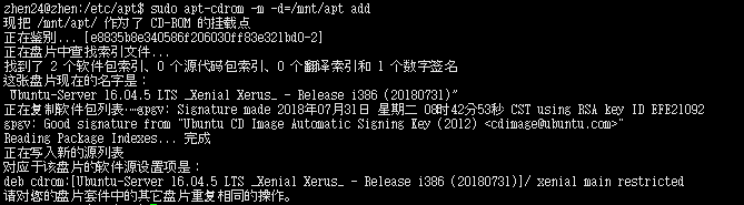 接着我们执行命令sudo apt-cdrom -m -d=/mnt/apt add,将我们挂载的apt设置成软件源即可,最后记得更新下软件源,sudo apt-get update sudo apt-get upgrade,这样我们就把本地源配置好了 。