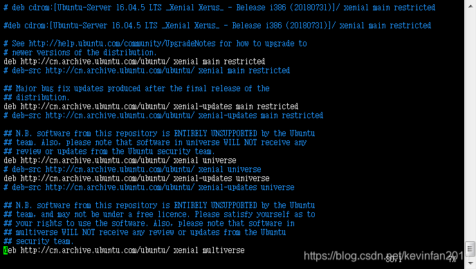接着我们就来配置软件源,将在线源修改本地的apt源地址,这里修改的是/etc/apt/下的sources.list文件,修改之前记得先备份一份(执行命令 : sudo cp sources.list sources.list.back),将文件中的deb http://security.ubuntu.com/ubuntudeb 改成file:/mnt/apt/ ./,但是这样改的很多,太麻烦了(vim操作不方便),这里我们还是将deb在线apt源注释掉(白色的这些),修改完成后保存该配置文件。