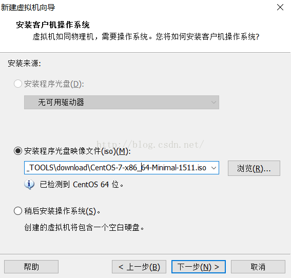 - 在CentOS镜像下载好的前提下选择:安装程序光盘映像文件,否则点击稍后安装操作新系统。下一步: