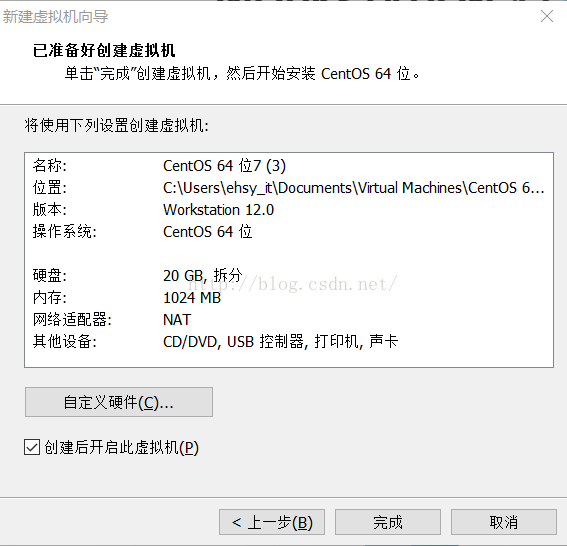 - 第3步中 如果选择了稍后安装操作系统的话,这里需要点击自定义硬件,否则直接点击完成即可:
