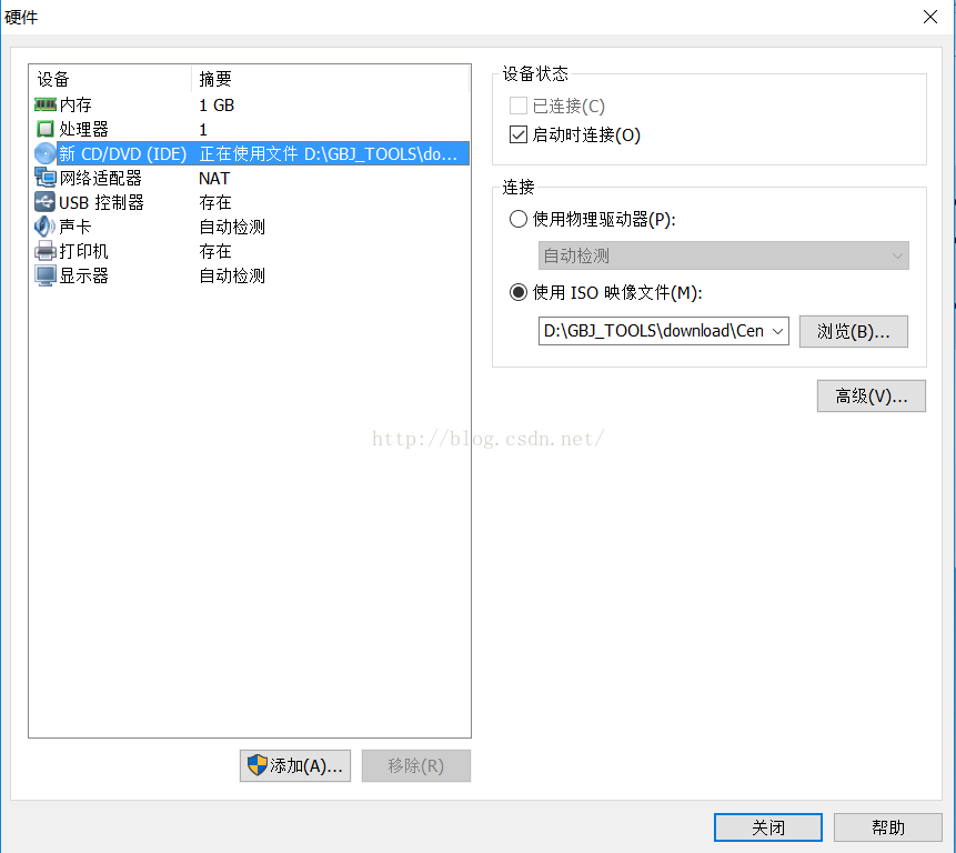 - 在硬件页下,点击新CD/DVD,再在右侧点击使用ISO映像文件,选中我们下载好的镜像文件,点击关闭即可: