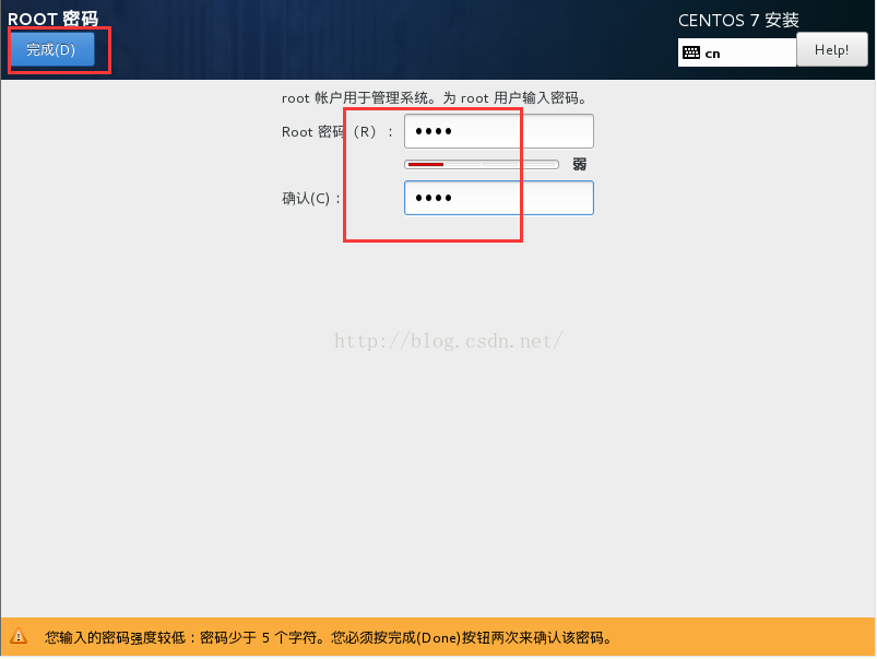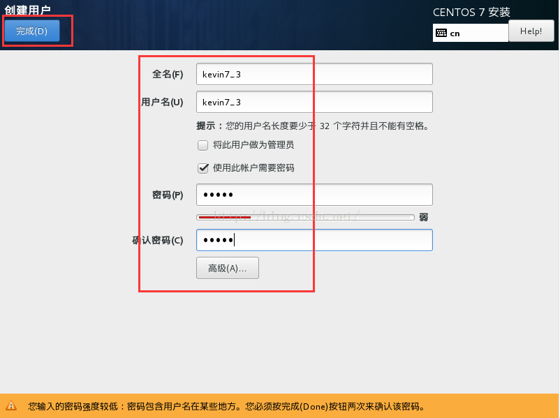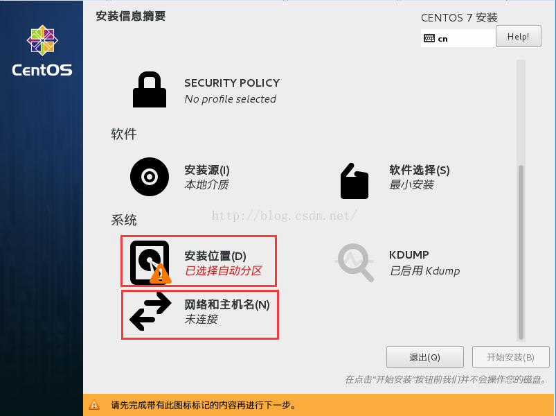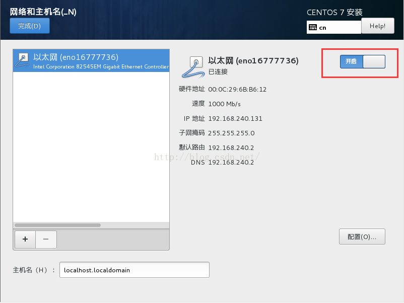 - 第10步中点击网络和主机名,需要配置下网络,否则安装好之后无法联网会有点小郁闷的;点击右上角的开启按钮,再点击左上角完成即可。