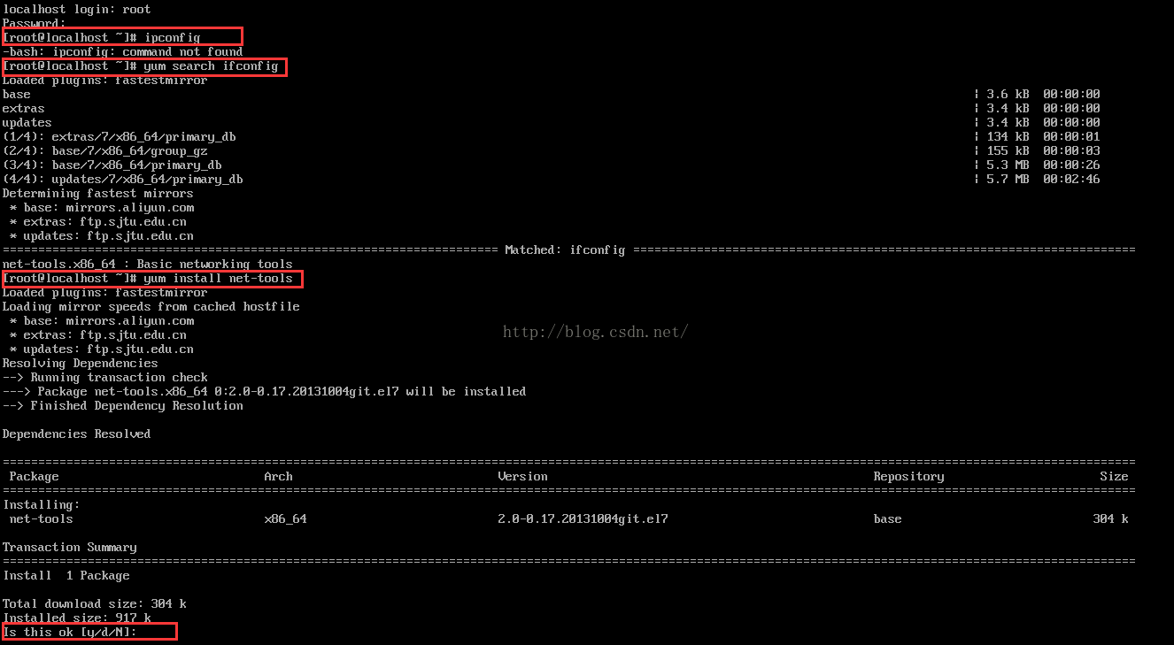 五、注意:当使用ifconfig或者unzip命令提示:command not found时,使用yum命令安装:先yum search ifconfig 查找安装包,使用yum install net-tools安装即可。