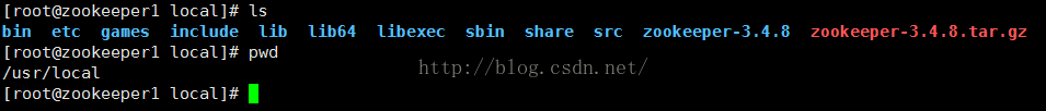 - 将下载的zookeeper-3.4.8.tar.gz包用rz命令上传(我用的是XShell,你也可以使用winSCP等工具)我这边上传到/usr/local下,并已经使用命令解压(tar -zxvf zookeeper-3.4.8.tar.gz)。