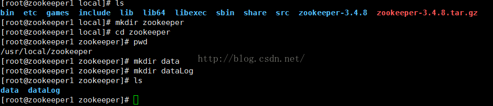 - 在/usr/local下创建一个文件夹叫zookeeper,并在zookeeper文件夹下再创建两个文件夹data和dataLog。