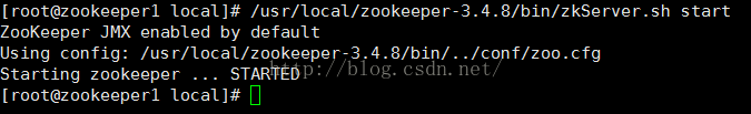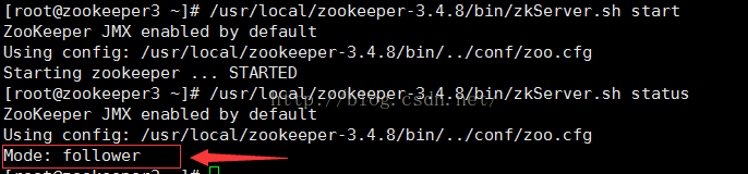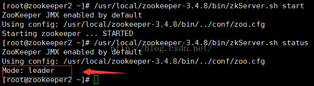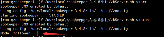 - 启动:/usr/local/zookeeper-3.4.8/bin/zkServer.sh start