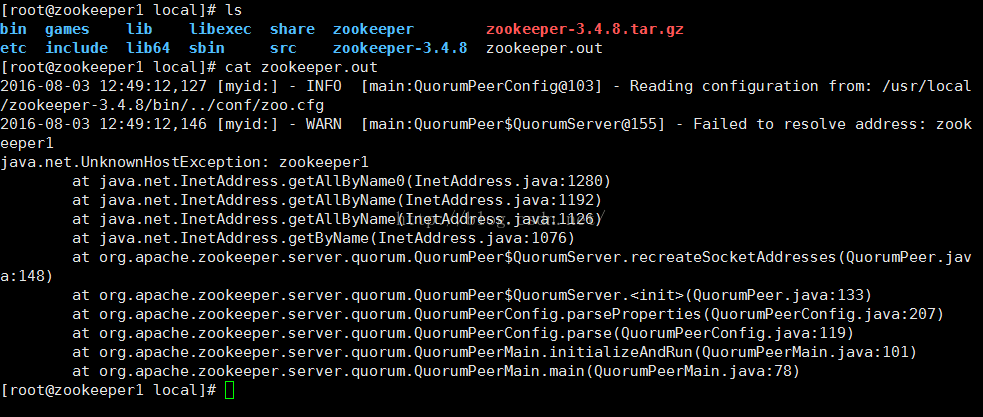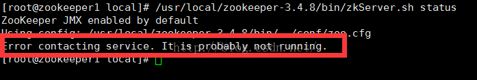 未正常启动,在启动时的目录下会有zookeeper.out文件,查看报错信息:cat zookeeper.out;重新启动前需要先停掉之前的进程或杀掉进程:/usr/local/zookeeper-3.4.8/bin/zkServer.sh stop
