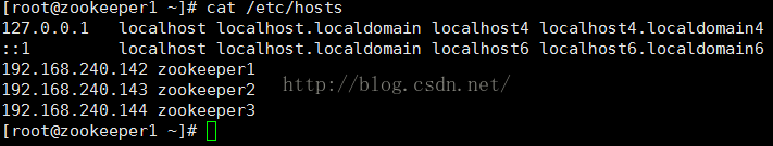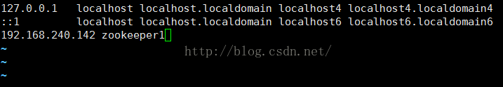 因为我们配置的是server.1=zookeeper1:2888:3888;没有修改/etc/hosts文件所以,计算机无法识别zookeeper1:我这台机子的地址是192.168.240.142,所以需要在/etc/hosts中加入: