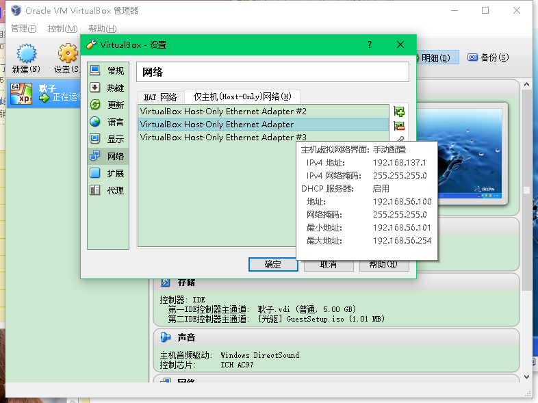 可以看出,该网络是192.168.137.1,可供分配使用的IP地址是192.168.56.101 - 192.168.56.254。