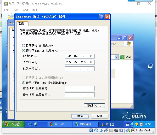 设置我们刚才看到的地址(192.168.137.1),我设定的是 192.168.137.2 在一定的范围中就行了