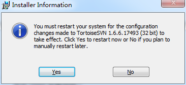点击Yes, 重启电脑, 重启之后右键点击桌面选项菜单中有TortoiseSVN,就安装成功了.