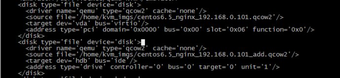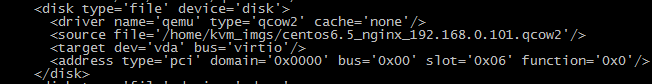 5.接着继续编辑我们的对应虚拟机的配置文件(virsh edit centos6.5_nginx_192.168.0.101)还是找到磁盘信息位置