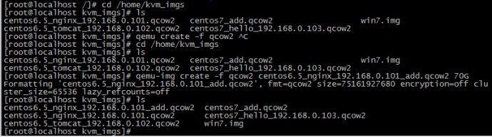 4.退出后创建新的磁盘qemu-img create -f qcow2 centos6.5_nginx_192.168.0.101_add.qcow2 70G(大小为70G,格式为qcow2,名字为centos6.5_nginx_192.168.0.101_add.qcow2)因为之前创建虚拟机的时候我的磁盘都是创建在/home/kvm_imgs的文件夹里的,所以把要新增的磁盘也放在这里面: