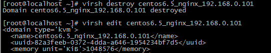 2.现在/dev/mapper/VolGroup-lv_root只有30G,回到物理机,关掉该虚拟机(virsh destroy centos6.5_nginx_192.168.0.101)并编辑centos6.5_nginx_192.168.0.101