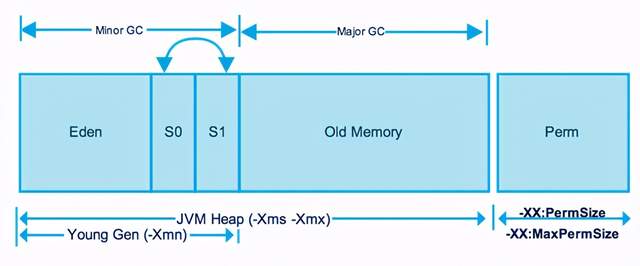 Java堆的内存划分如图所示,分别为年轻代、Old Memory(老年代)、Perm(永久代)。其中在Jdk1.8中,永久代被移除,使用MetaSpace代替。