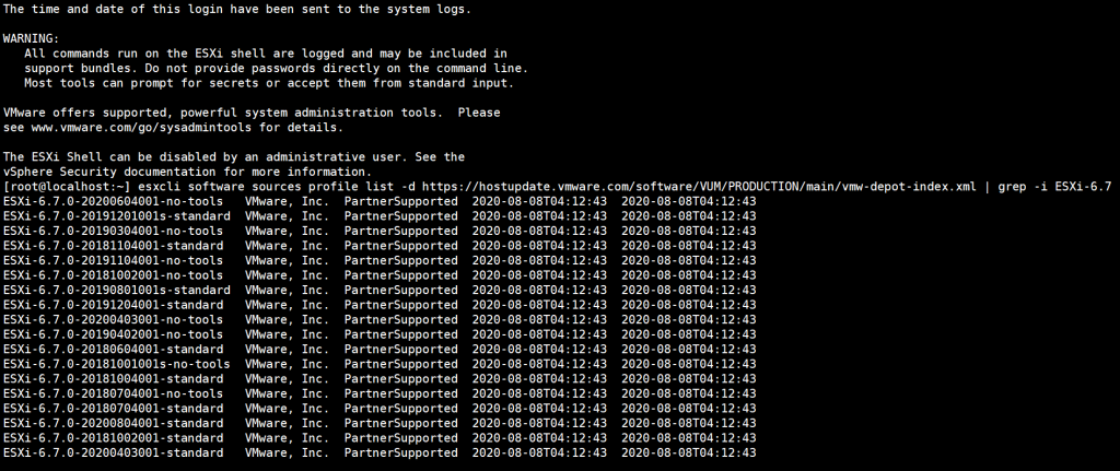 esxcli software sources profile list -d https://hostupdate.vmware.com/software/VUM/PRODUCTION/main/vmw-depot-index.xml | grep -i ESXi-6.7 ##此为查看有哪些6.7的安装包