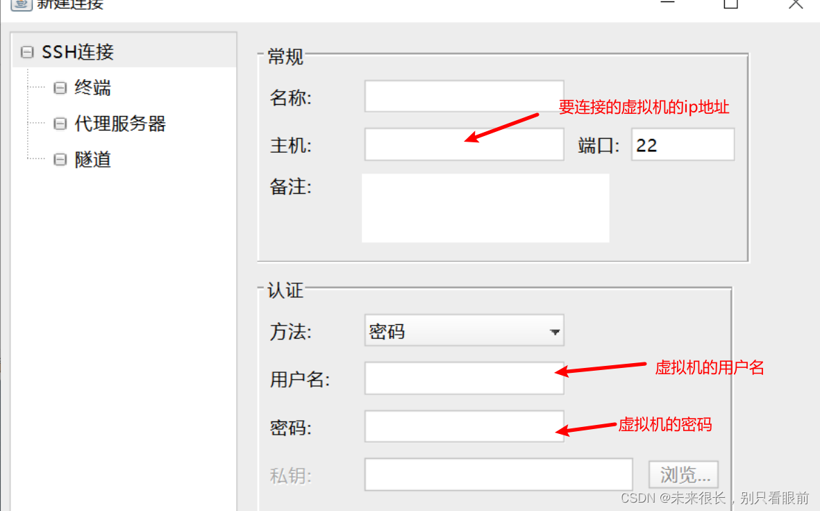 出现下面的窗口:这个主机要写你要连接的服务器的ip地址,这里我们填自己这个虚拟机的ip地址就行(在本机的虚拟机使用 ip addr 查看自己的虚拟机的IP地址);