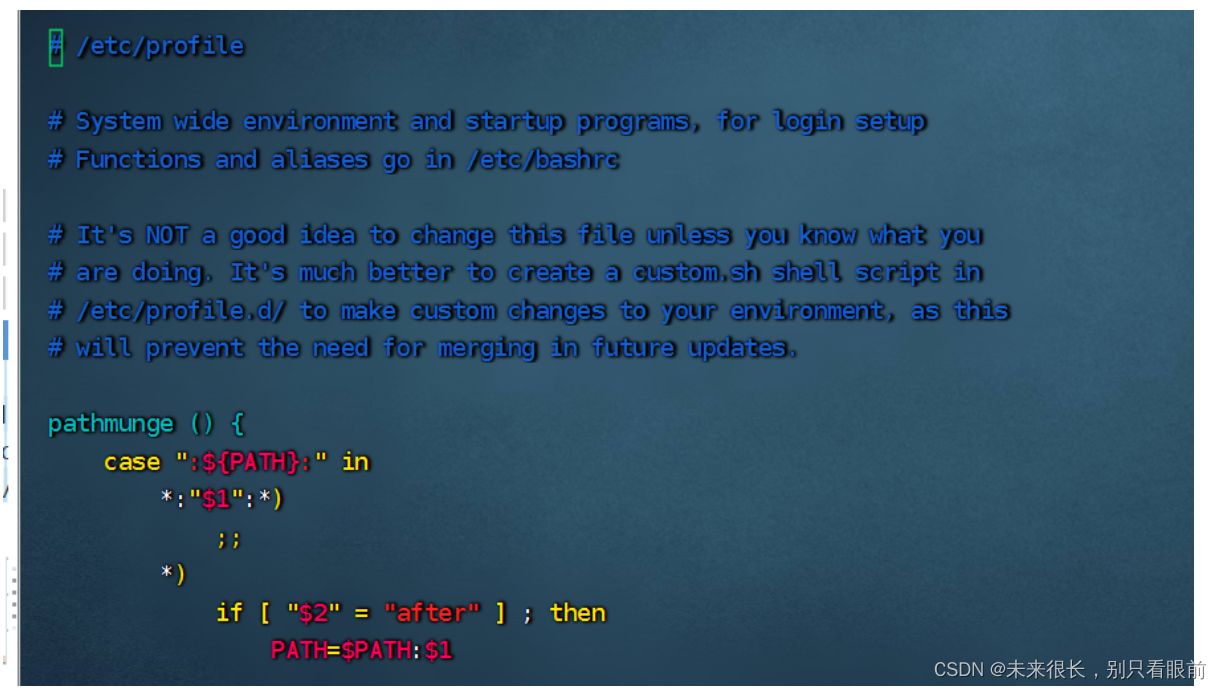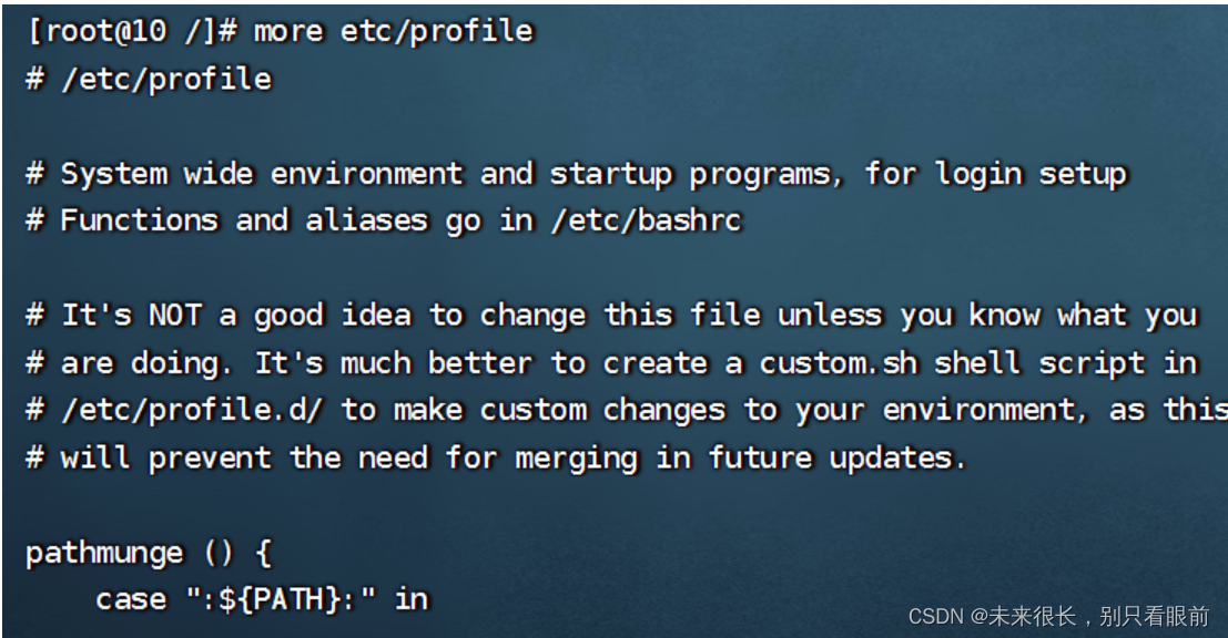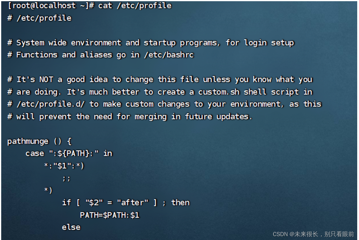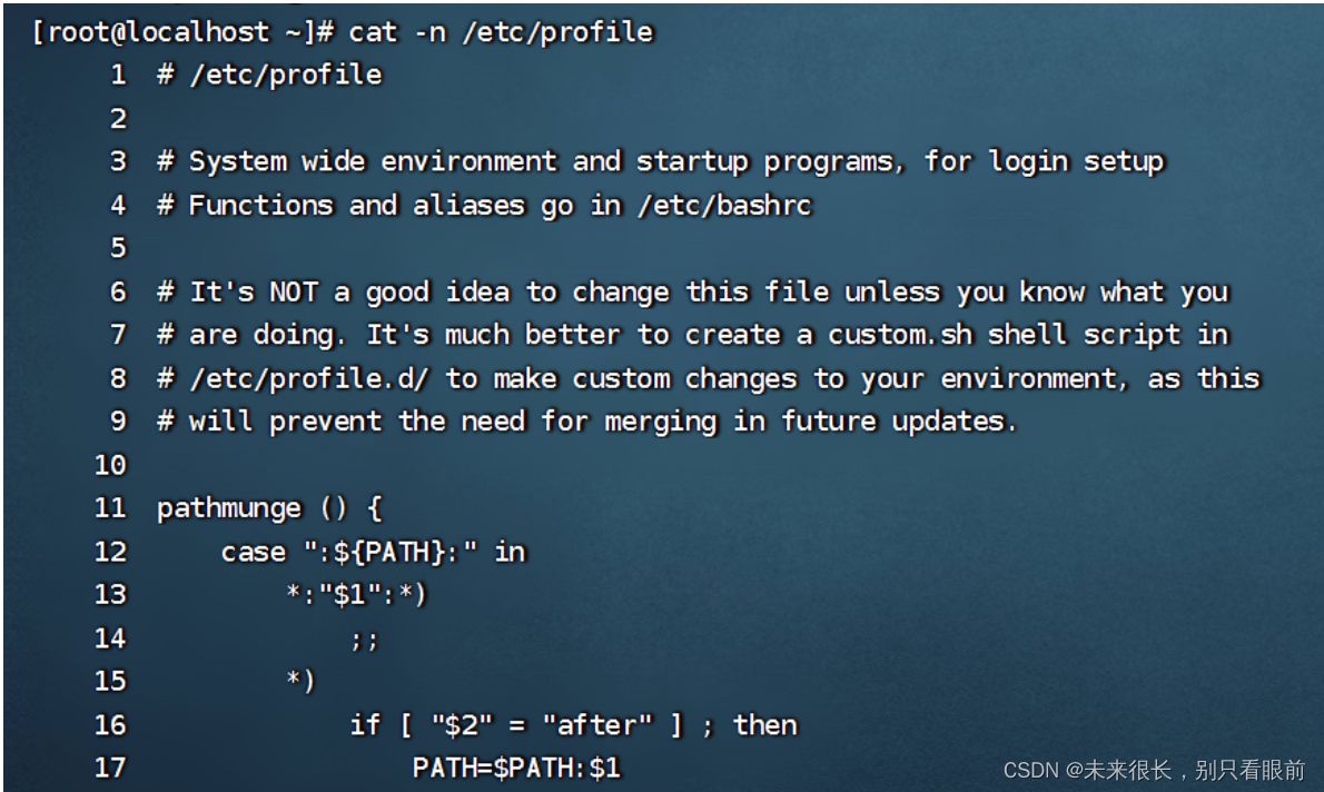 举例:cat /etc/profile 查看/etc目录下的profile文件内容