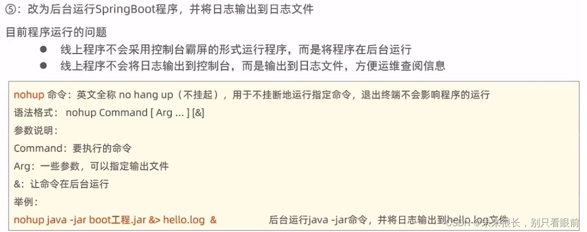 nohup java -jar reggie_take_out-1.0-SNAPSHOT.jar &> app.log & # 这里的log文件是相对路径下的文件,会在我们执行该行命令的目录下生成这个log文件 最后一个&表示在后台运行