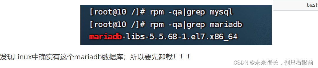 rpm -qa|grep mariadb #查询当前系统中安装的名称带mariadb的软件 这个是centons中自带的一个数据库,如果你的虚拟机中有这个软件要先把这个软件给卸载然后再安装MySQL,不然会出现数据库冲突的情况