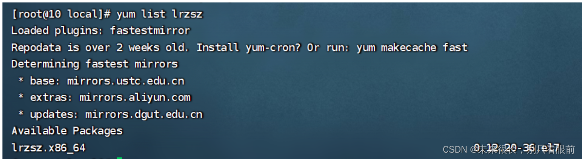 1.搜索lrzsz安装包,命令为 yum list lrzsz (这个命令的作用是在应用商店搜索lrzsz这个安装包)
