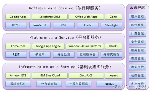 在管理方面,主要以云的管理层为主,它的功能是确保整个云计算中心能够安全和稳定的运行,并且能够被有效地管理,主要包括用户管理、监控系统、计费管理、安全管理、服务管理、资源管理、容灾支持、运维管理、客户支持几个方面。