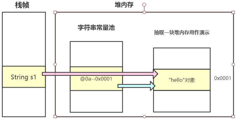 字符串对象(内存地址0x0001),然后到字符串常量池中注册地址为0x0001的hello