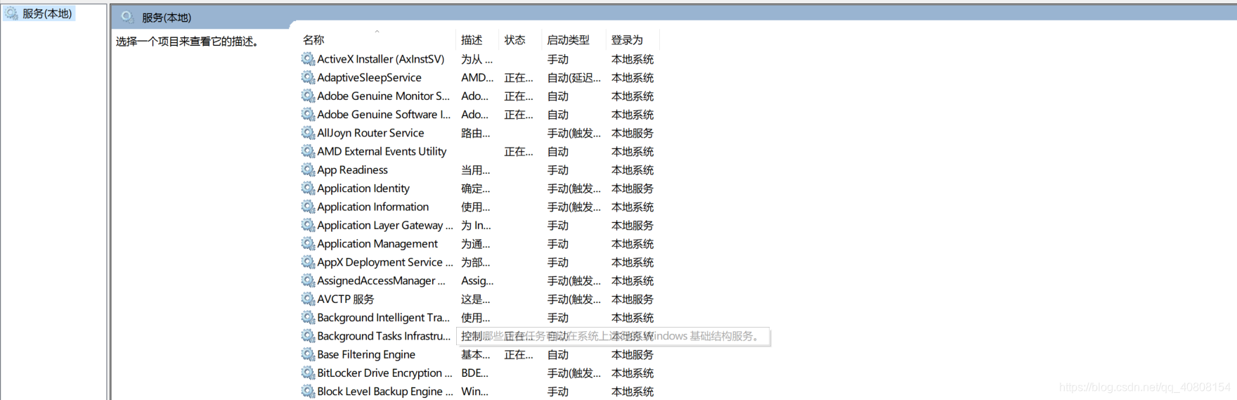 解决方法:windows+R打开命令行窗口,输入:services.msc 回车,出现下列界面: