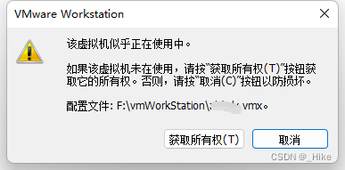 首先点击“获取所有权(T)”按钮,会弹出一个窗口,显示“无法打开虚拟机:F:\vm\test.vmx获取虚拟机的所有权失败,主机上某个应用程序正在使用该虚拟机等等”,说明获取所有权失败