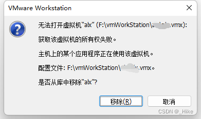 解决:只需要找到你存放该台vm虚拟机虚拟磁盘文件及配置文件存放的位置,并且找到后缀为.lck文件夹,将其删除即可,若避免删除,可先移动备份文件夹,然后重新打开虚拟机即可解决!