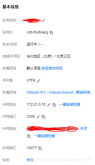 点击数据库实例名,打开外网连接【这个过程需要等几分钟】。完成之后刷新页面即可看到外网地址和端口号。