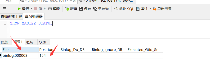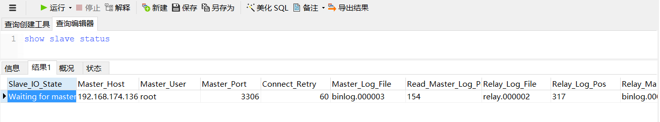 CHANGE MASTER TO MASTER_HOST='192.168.174.136',MASTER_USER='root', MASTER_PASSWORD='123456',MASTER_LOG_FILE='binlog.000003',MASTER_LOG_POS=154;