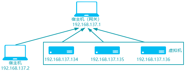 这里的宿主机充当网关的角色,在虚拟机的/etc/sysconfig/network-scripts/ifcfg-ens33文件中也会写死网关IP,如下所示。