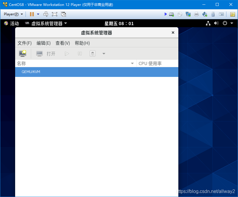 如果您的virt-manager已成功连接到本地KVM虚拟机管理程序,则可以创建虚拟机了。如果连接失败,请检查/user-home /。cache/virt-manager/virt-manager.log日志文件。