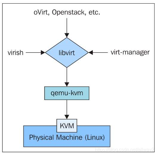 它变得越来越混乱了,对吧?如果qemu-kvm可以运行虚拟机,那么为什么需要使用libvirt。答案很简单,libvirt管理qemu-kvm,而qemu-kvm运行KVM虚拟机。